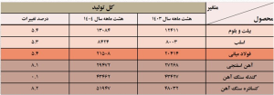 از سوی دیگر، برخی محصولات نهایی نزولی ظاهر شدند. تولید مقاطع تخت شامل ورقهای گرم، سرد و پوششدار با ۴.۸ درصد کاهش و مقاطع طویل خاص مانند تیرآهن با ۲۷.۴ درصد کاهش همراه بود. تنها میلگرد فولادی با افزایش ۶.۹ درصدی و کل مقاطع طویل با رشد دودرصدی همراه شدند.