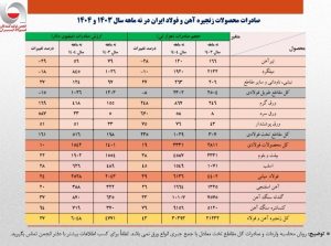براساس این گزارش، در این مدت اگرچه صادرات کل مقاطع طویل فولادی با کاهش ۱۵ درصدی در ارزش و ۸ درصدی در وزن مواجه شده اما صادرات کل مقاطع تخت فولادی رشد ۱۶۱ درصدی در ارزش و ۲۳۵ درصدی در وزن را تجربه کرده است، همچنین صادرات فولاد میانی شامل بیلت و بلوم و اسلب ۲۴ درصد از نظر ارزشی افزایش یافته است.